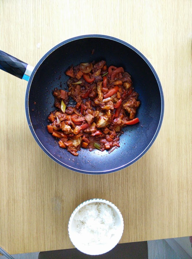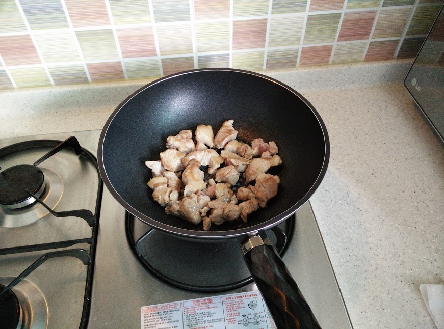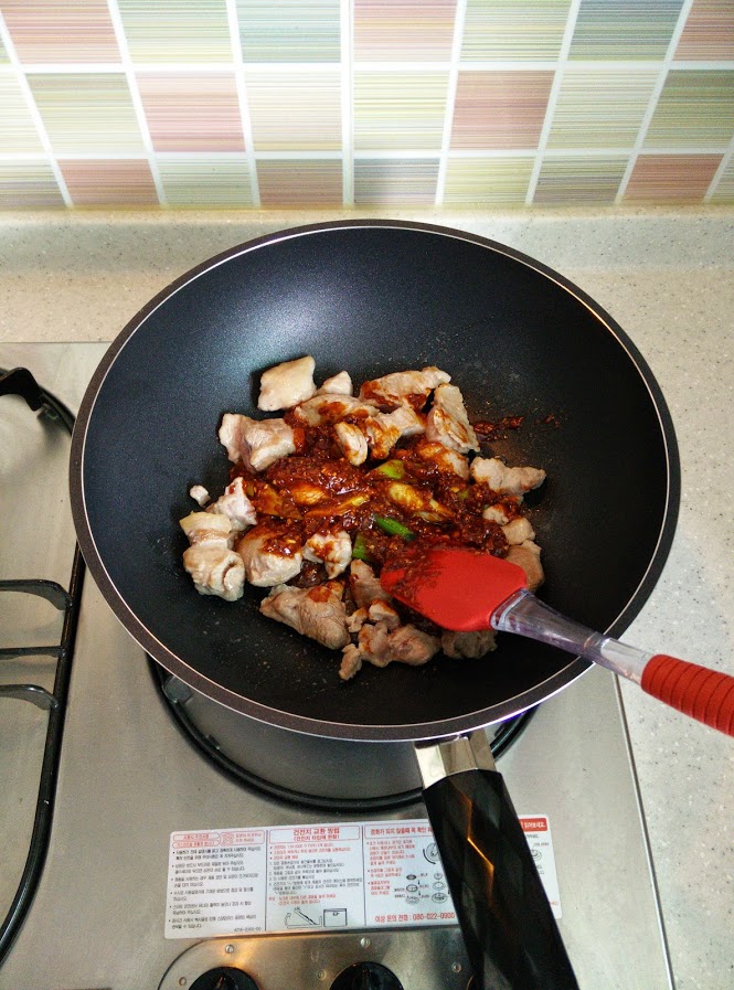 고기를 먼저 좀 익힌 다음 양념을 투하한 것은 잘한 선택인 듯합니다. 처음부터 같이 볶았으면 양념이 탔을 수도 있겠단 생각이 들었거든요. 얇은 고기들로 하는 제육볶음이 아닌 만큼...
