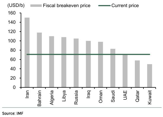 그래프를 보면 사우디도 현재의 유가에서 재미볼 일이 별로 없습니다. 그런데 그보다 더 큰 피해를 입는 나라들 중에 러시아와 이란이 있다는 점이 흥미롭지요.