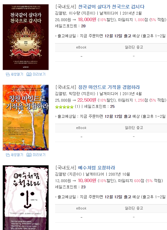 거의 대부분의 책이 '김열방'이라는, 이름부터 기독교의 기름부음의 냄새가 콸콸 풍기는 사람이 쓴 것이다.