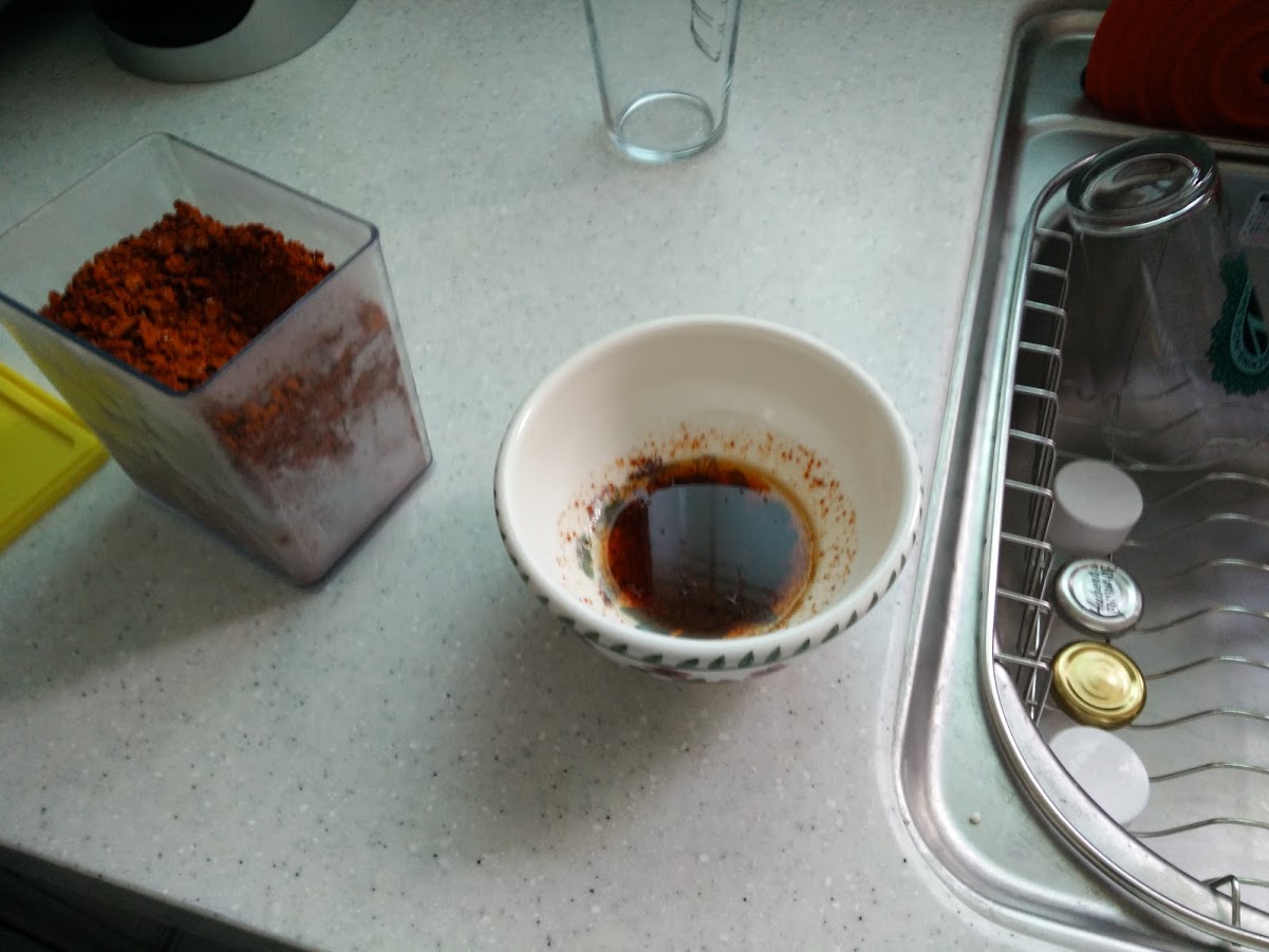 고추기름을 따로 갖고 있지 않아 식용유와 고추가루를 섞은 다음 전자렌지에