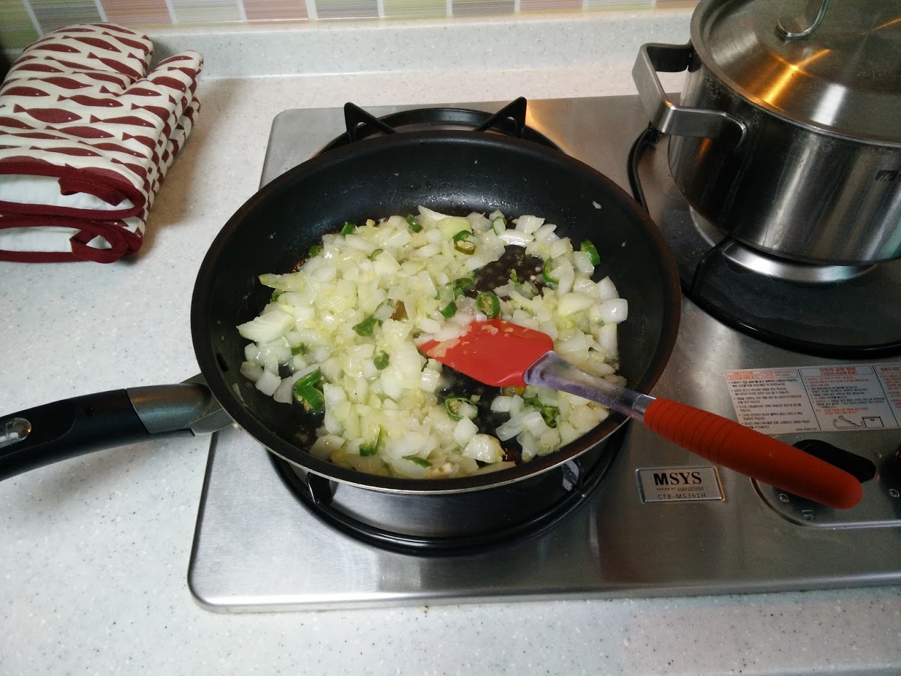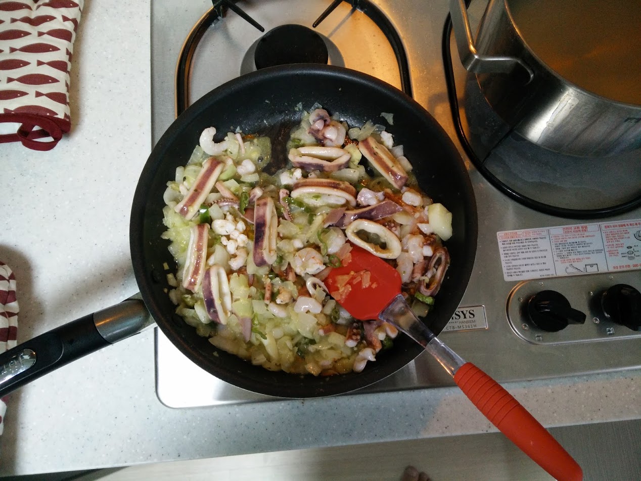 양파가 어느 정도 익어서 투명하게 되면 오징어와 새우살도 투입. 여기서