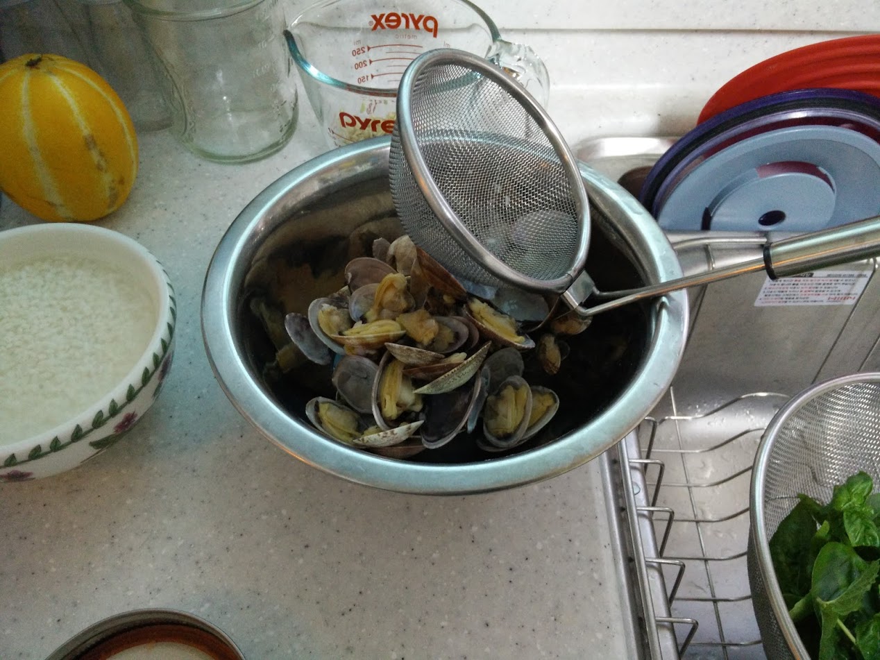 해감시킨 바지락을 끓여 육수를 만듭니다. 바지락은 건져내서 나중에 살만