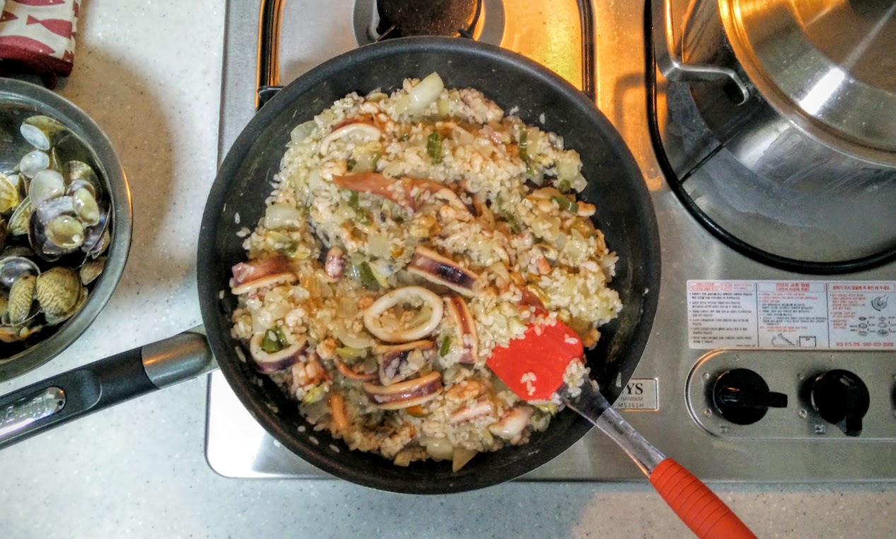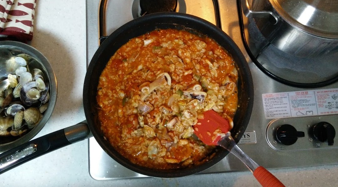 해산물이 중간 정도 익었다 싶으면 이제 밥을 투입하는데 이 부분이 가장 중요합니다. 타거나 눌어붙지 않으면서 밥이 충분히 익을 수 있도록 해야 하거든요.