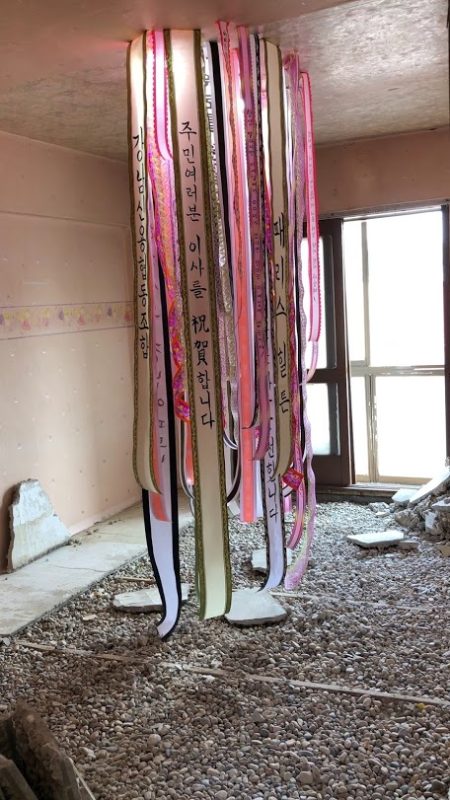 Kim told me some messages he wrote on the ribbons were from the postcards and letters he found in the ruin of the room and other place in the apartment.