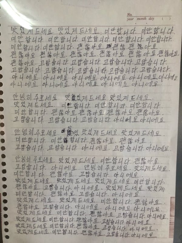 What makes this seemingly ordinary piece of a Korean learner's book is the scribbles at the edge of the page: