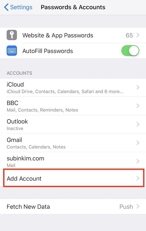 '아이폰 설정 > 패스워드 & 계정'으로 가서 '계정 추가'를 선택한다.