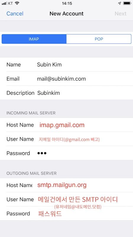 IMAP은 지메일의 것을 그대로 입력하면 되고,