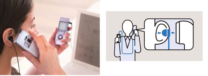 이어폰 형태로 귀 속에 넣는 마이크를 쓰는 겁니다.