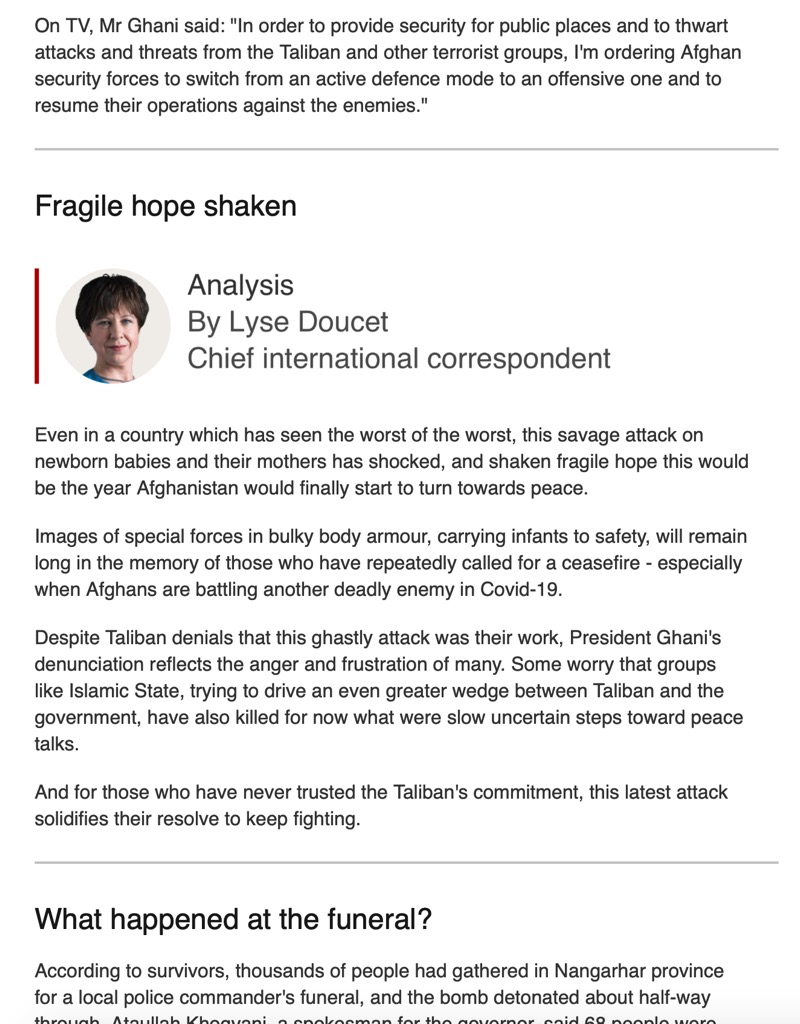 아프간에서 발생한 산후조리원 공격에 대한 BBC 기사는 이러한 특징을 잘 보여준다. 본문 중간 중간의 중제에 주목할 것.