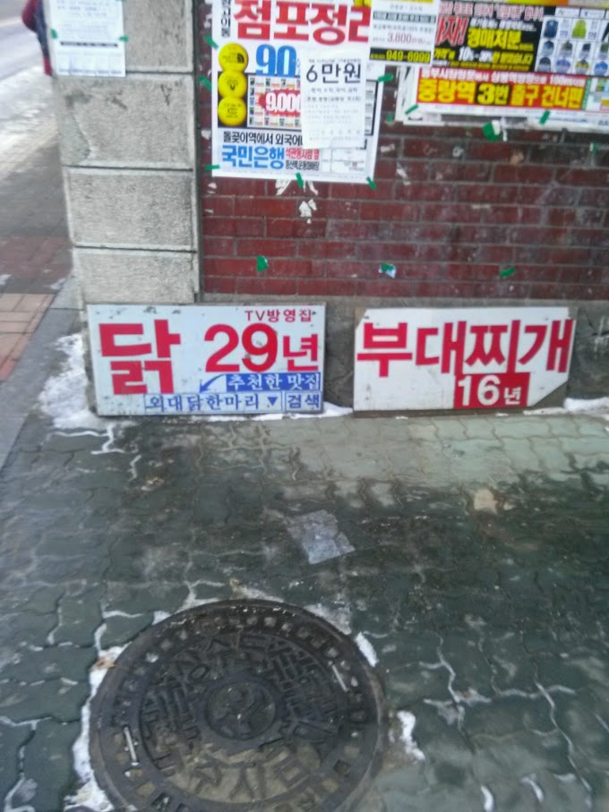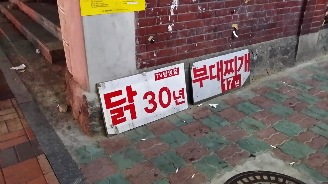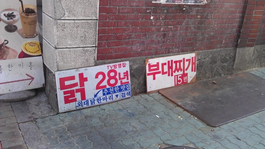 외대 정문 쪽에 위치한 닭+부대찌개 집의 광고 간판. 나는 지난 3년간 이 간판을 관찰해왔다: