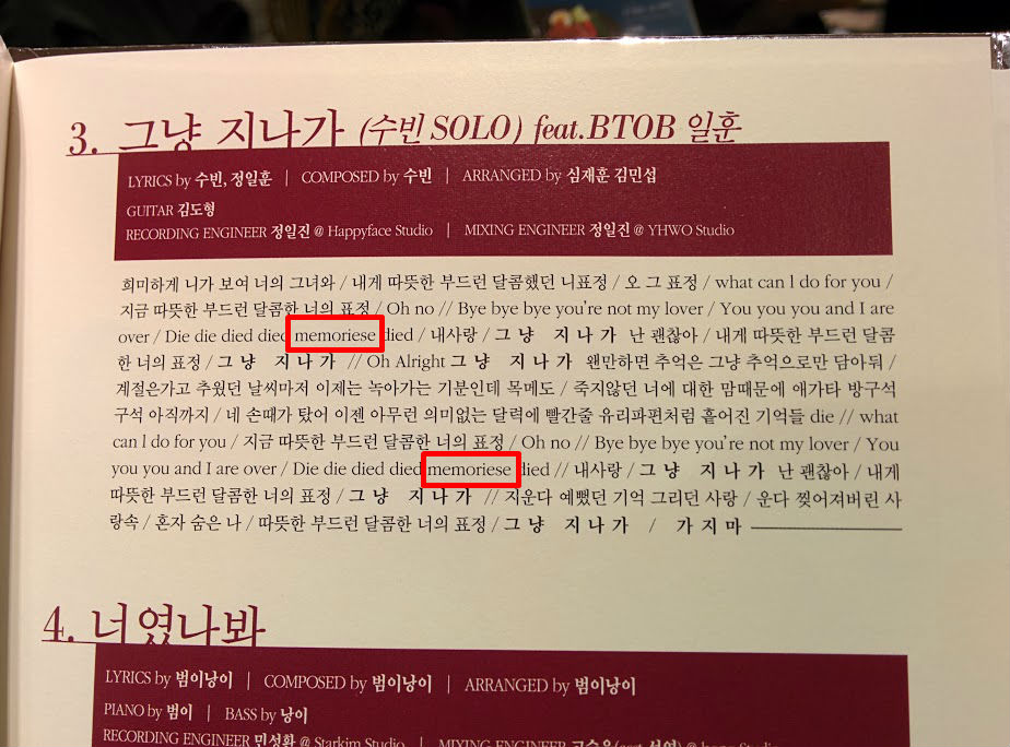 여기에 보니까 수빈양이 직접 작사/작곡한 노래가 하나 있더라고요. 그런데 여기에도 smail 사건과 비슷한 실수가 있었습니다: